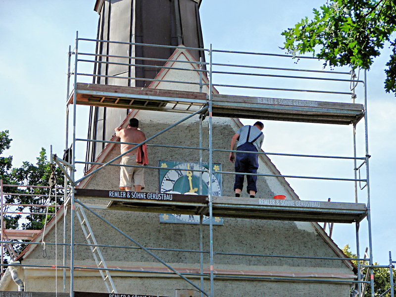 (rl) Nachdem alle vorbereitenden Arbeiten abgeschlossen sind, begannen heute die Gemeindearbeiter damit, die Farbe für die neue Fassade der Kirche aufzutragen – bei den zur Zeit anstehenden Temperaturen eine Schweiß treibende Angelegenheit. Man hat sich für einen warmen Creme-Ton entschieden. Abgestzt werden soll er zum Beispiel am Sockel mit einem dunkleren Braun.