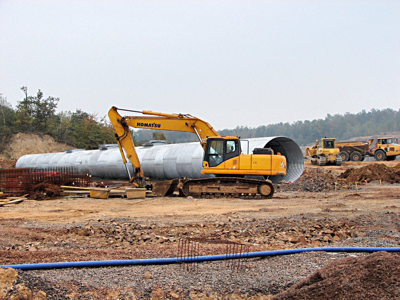 Da, wo man im Frühjahr den Mutterboden weggeschoben hat (wir berichteten), liegt jetzt ein gewaltiges Stück „Rohr“ mit drei Öffnungen nach oben. Auf diese wird künftig das vorgesiebte Rohmaterial als Kegel aufgeschüttet. Es rutscht durch die entsprechenden Öffnungen, die man nach Bedarf öffnen und schließen kann, auf ein im Innern befindliches Förderband.