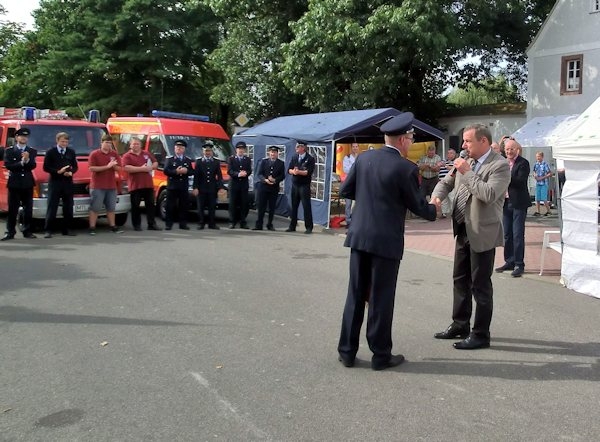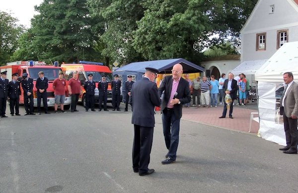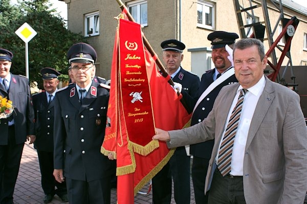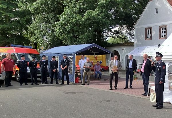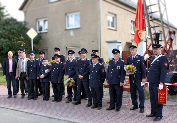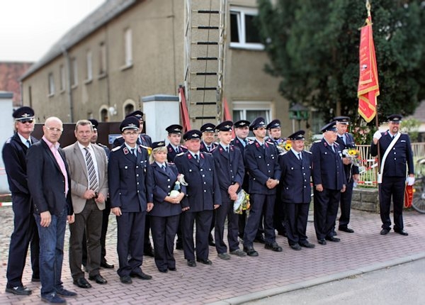 Aufgewertet wurde die Feier durch die Teilnahme des CDU-Landtagsabgeordneten Sven-Gunnar Kirmes, des Bürgermeisters Jürgen Krteschel und durch Michael Pohl, der als Vertreter des Gemeindewehrleiters gekommen war. Damit gab es einen festlichen Rahmen für Auszeichnungen und Neuaufnahmen. Ein besonderes Geschenk brachte Jürgen Kretschel mit, der ein Festband, das an das heutige Jubiläum erinnert, an die Feuerwehrstandarde heftete.