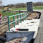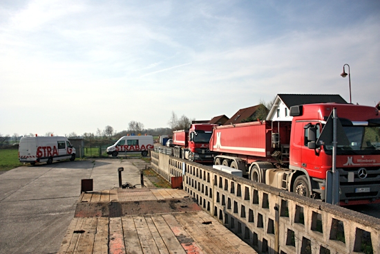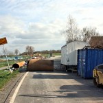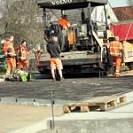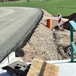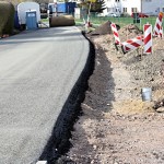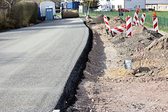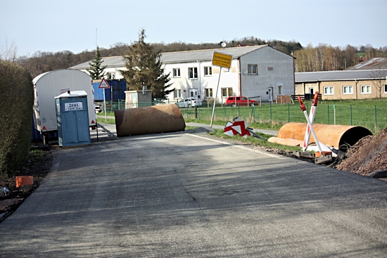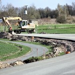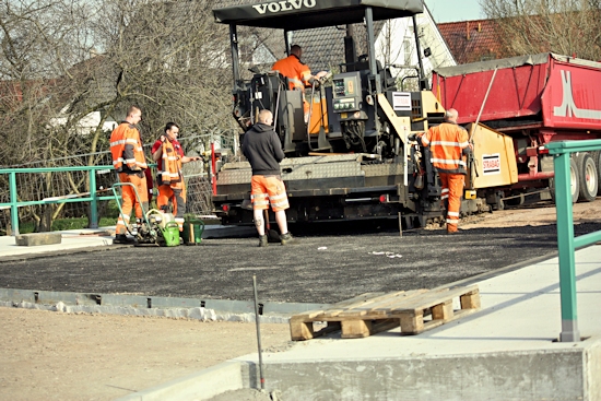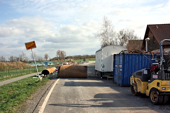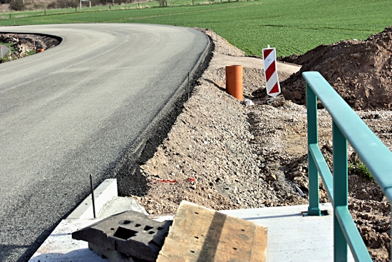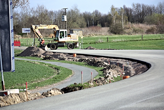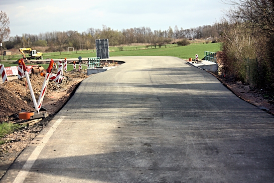 Ab 18. 4. 2013 waren jede Menge Fahrzeuge im Einsatz, um die Cladebrücke und die Anschlüsse an die Grethener Straße zu asphaltieren. Bange Blicke der Verantwortlich in Richtung Wolken zeigten die Sorge, dass das Wetter alle schöne Planung im wahrsten Sinne des Wortes ins Wasser fallen lassen könnte. Doch der Regen ging anderswo herunter und die Arbeiten konnten zügig fortgeführt werden. Man blieb in der vorgegebenen Zeit und so kann die Grethener Straße am Mittwoch, dem 24. April um 13:30 Uhr eröffnet werden. Dennoch bleibt noch Einiges zu tun. Die Markierungen müssen noch aufgebracht werden. Leitplanken an der Brücke sowie Anschluss-Pflasterarbeiten im Bachbett sind noch nötig. Und vor allem wird die Brücke für den Radweg ausgewechselt. Augenblicklich wird über eine Behelfsbrücke gefahren.