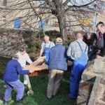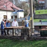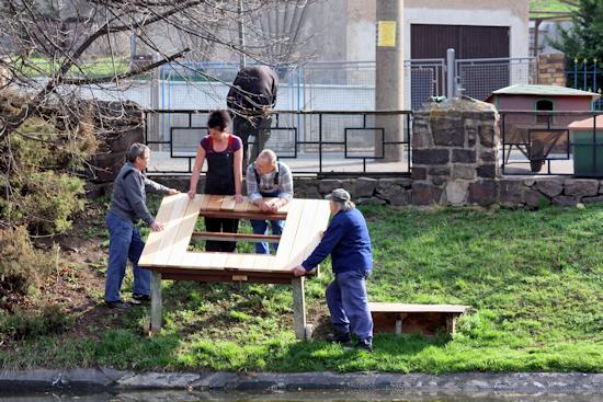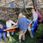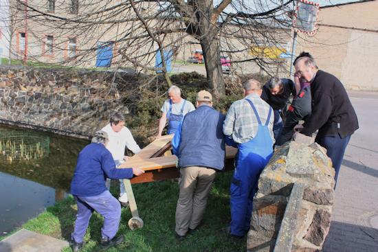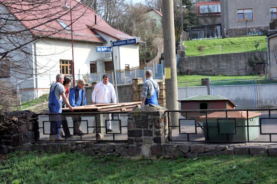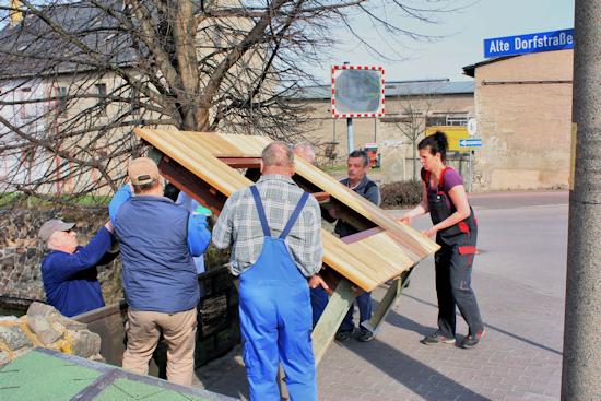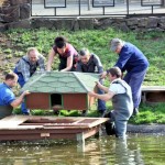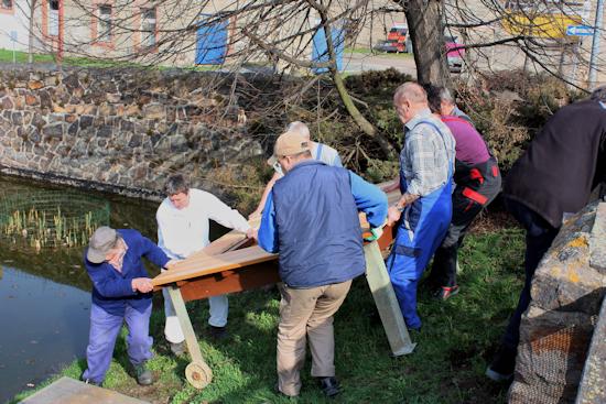 Und heute war es wieder so weit. Gerd Heinitz, die Truppe vom Bauhof und Armin Pöritz waren bei bestem Wetter angerückt, das Entenhaus in den Teich zu bringen. Weil es sich um meist gut aufgelegte Leute handelt, gab es dabei auch manches Späßchen. Reinhard Frieß und Gerd Heinitz hatten für gutes Holz gesorgt. Mit Lärchenbrettern konnte Armin Pöritz ein neues Podest für das Entenhaus bauen. Das dürfte einige Zeit halten, verwendete man dieses Holz doch früher schon zum Schiffsbau.