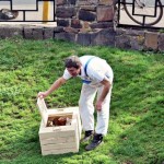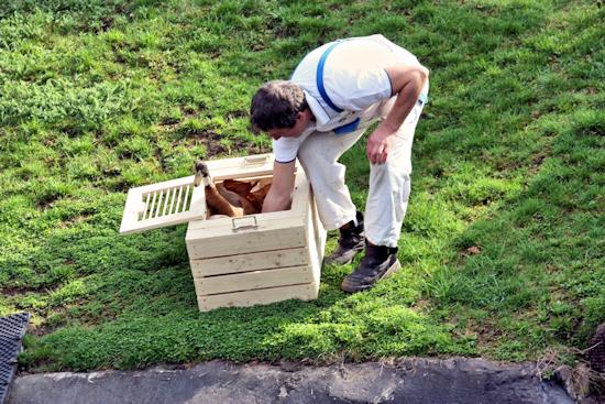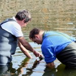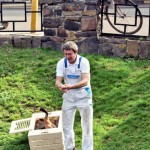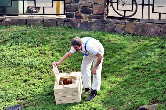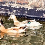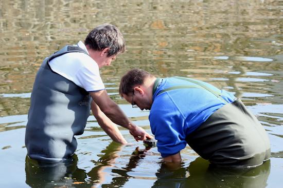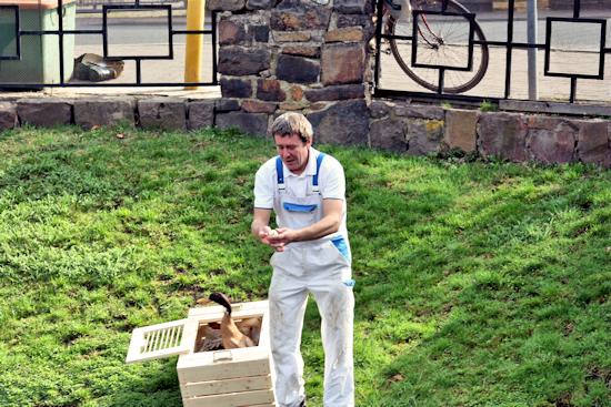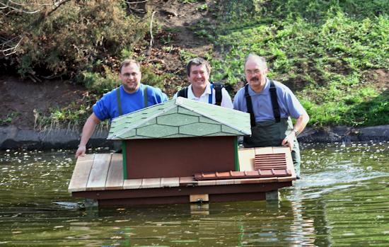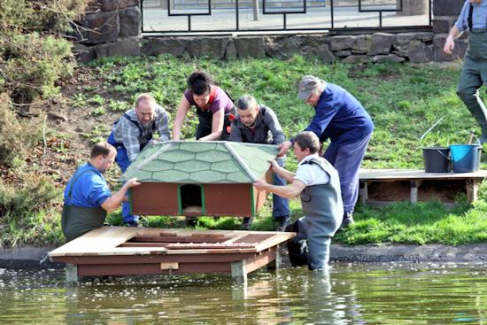 Nachdem Pöritz genügend Futter ins Häuschen gegeben hatte, ließ Heinitz die bereits mitgebrachten Enten frei. Er war nicht wenig erstaunt, als er im Transportkasten bereits das erste Ei entdeckte. Zur Belüftung des Teiches wurde die über Winter eingelagerte Fontäne installiert.