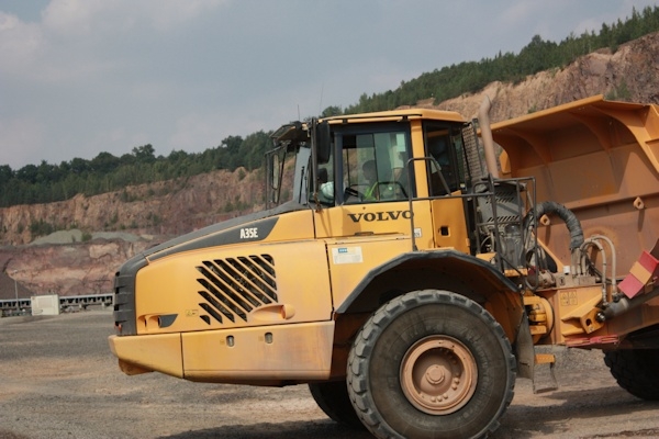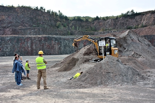 Parthensteins Bürgermeister Jürgen Kretschel und Rolf Langhof, Vorstand des Heimatvereins sowie Ortschronist von Großsteinberg, gehörten zu den Teilnehmern, ebenso der Großsteinberger Bauingenieur Eberhard Fischer. Offizieller Anlass: Eröffnung der neuen Aufbereitungsanlage und der Bahnverladung. Stefan Rüppel als Vertreter der Firmenleitung übernahm die Begrüßung der geladenen Gäste, gab einen Überblick über den geleisteten und nun zum Abschluss gebrachten Umbau des Werkes, der ja eigentlich ein Neuaufbau ist und er stellte die Gastredner vor, die gekommen waren, ein Grußwort zu sprechen. So war auch Europaabgeordneter Hermann Winkler (CDU) gekommen, der natürlich in seiner Rede einen Bogen schlug von den Unternehmen und Unternehmern bis hin zum Projekt Europäische Union. Jürgen Kretschel brachte die Anwesenden in seiner direkten und humorvollen Art mehrfach zum Schmunzeln. Eine Besichtigung des Bruches, von den Fachleuten als Tagebau bezeichnet, stand weiterhin auf dem Programm und danach als Abschluss eine Präsentation der historischen Entwicklung des Werkes und der eingesetzten Technik. Am folgenden Sonnabend standen die Türen offen für alle interessierten Gäste aus Großsteinberg, Parthenstein und der weiteren Umgebung. Doch wie feiert man einen solchen Anlass in einem Werk, wo alles aus Stein, Splitt und Staub besteht? Hartmut Hempel, Betriebsleiter des Großsteinberger Werkes und seine Mitarbeiterinnen und Mitarbeiter haben es jedenfalls verstanden, ihren Betrieb auf Hochglanz zu polieren. Für den Shuttle-Bus, der die Gäste in den Tagebau direkt vor Ort und wieder zurück brachte, gab es eine extra angelegte Fahrstraße. Die gut ausgeschilderten und mit vielen Informationen versehenen Rundgänge waren mit ordentlich aufgestellten Bauzäunen abgesichert. Um Staub zu verhindern, drehte ein Sprühfahrzeug seine Runden und hielt die Wege feucht. Das tut es übrigens auch während der ganz normalen Produktionstage, um die Umwelt mit so wenig wie möglich Staub zu belasten.