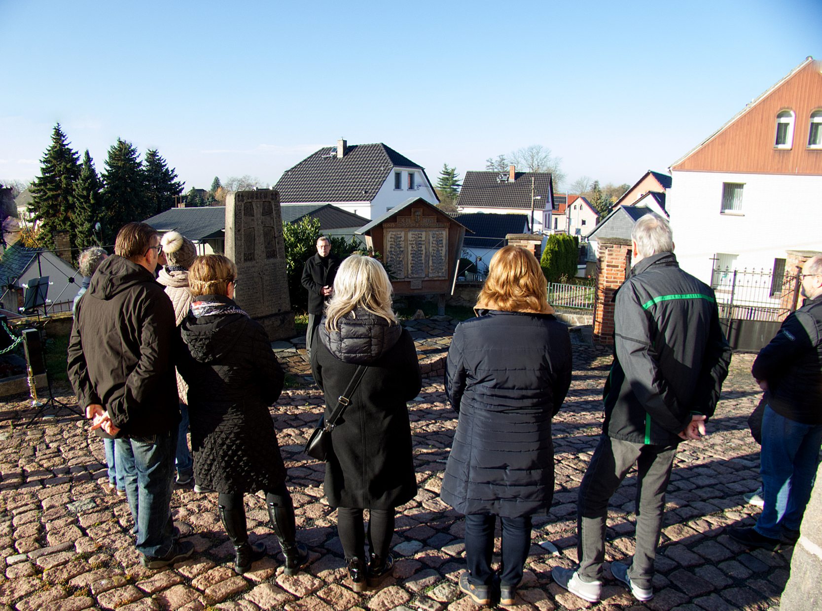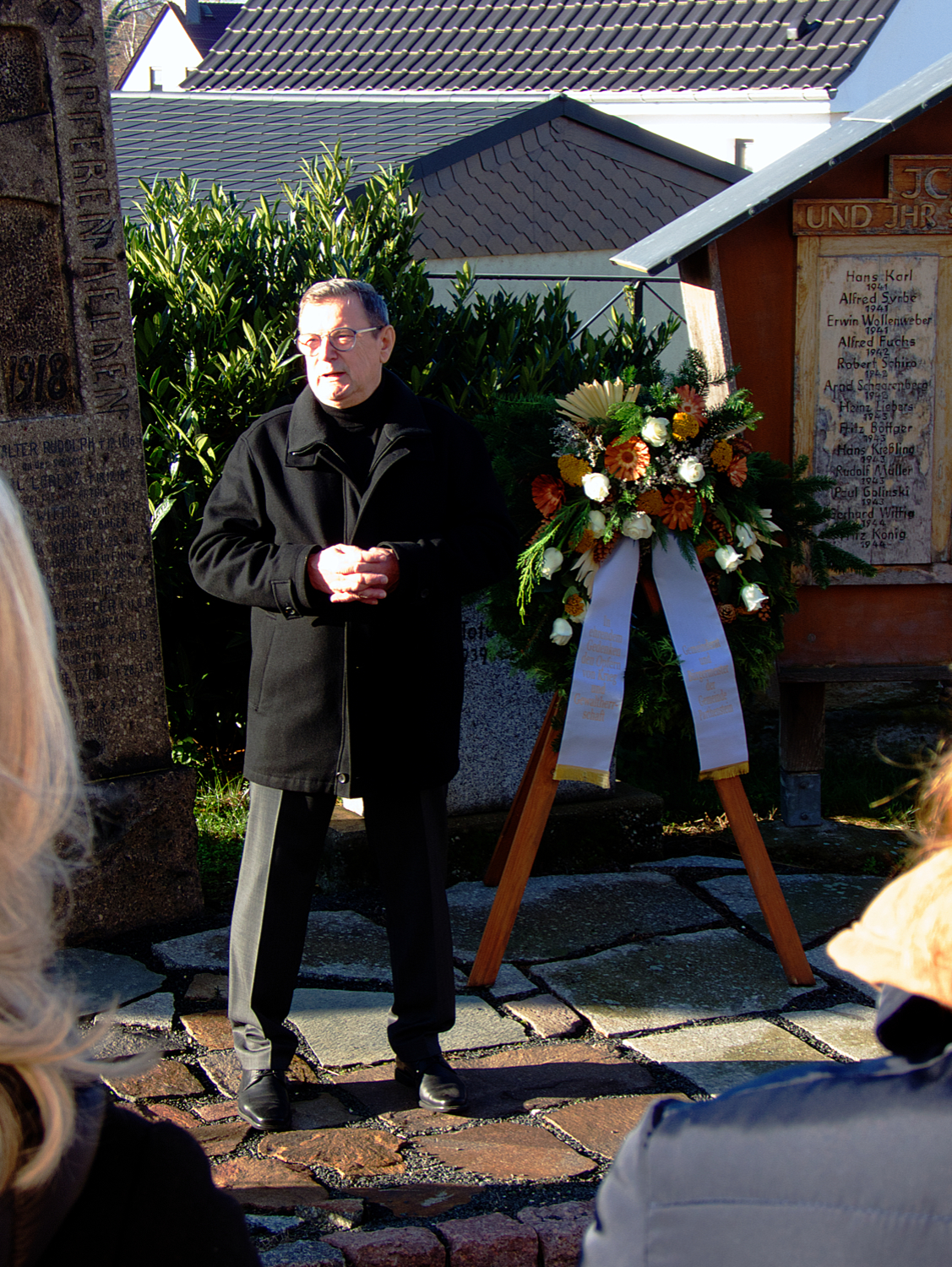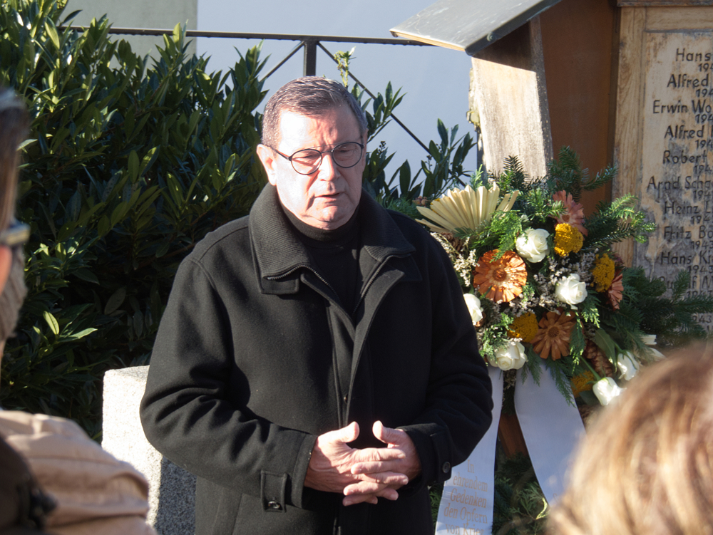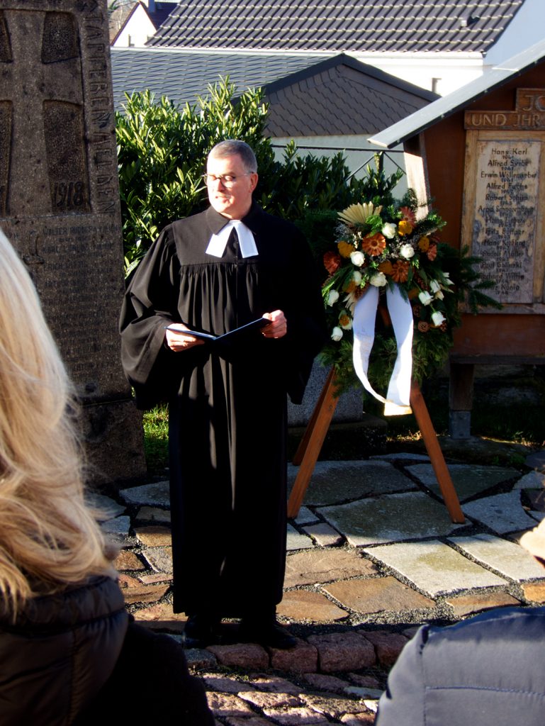 Nahe bei den Gedenkstätten für die Gefallenen der beiden Weltkriege halten der Bürgermeister und die jeweilige Pfarrerin, der jeweilige Pfarrer die Ansprachen zum Gedenken.