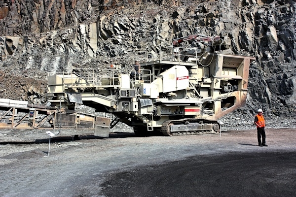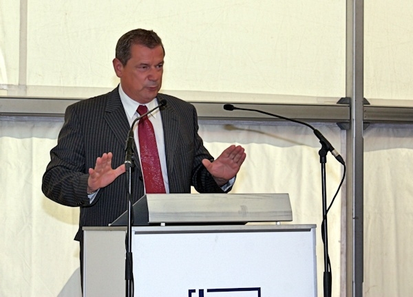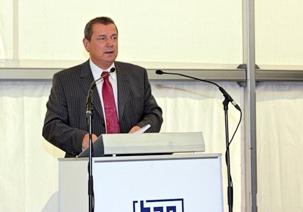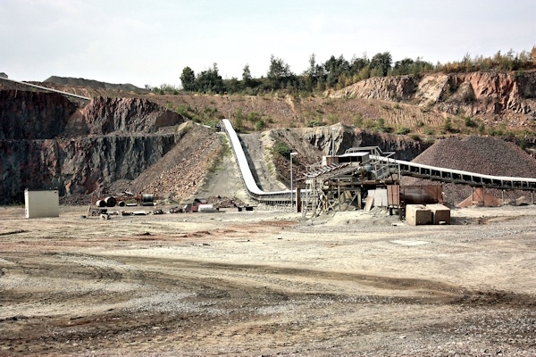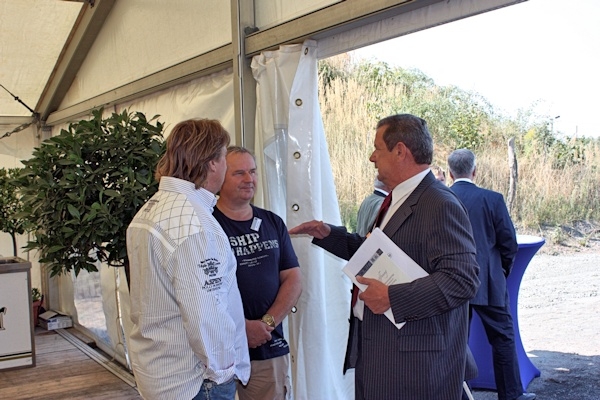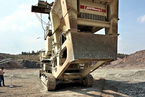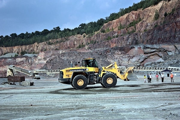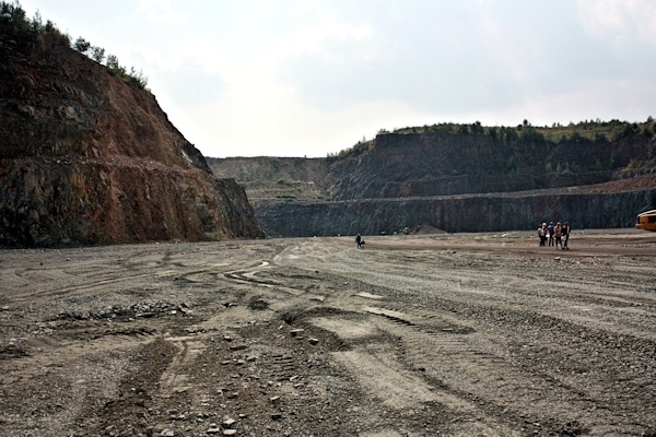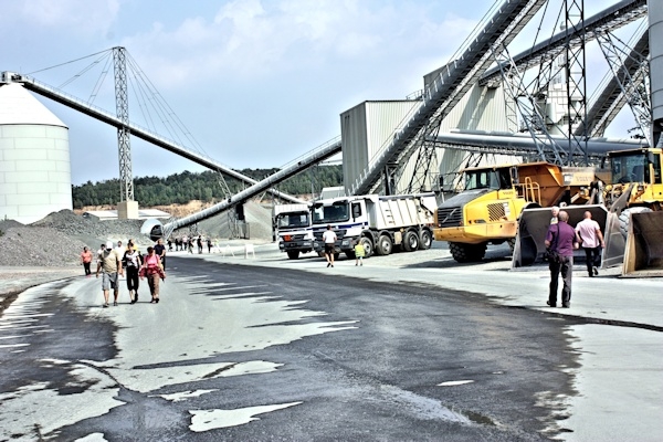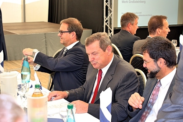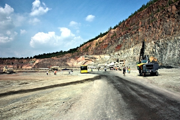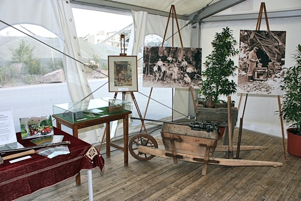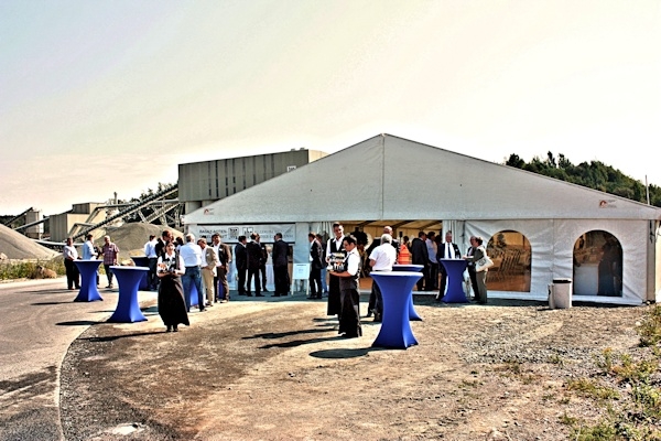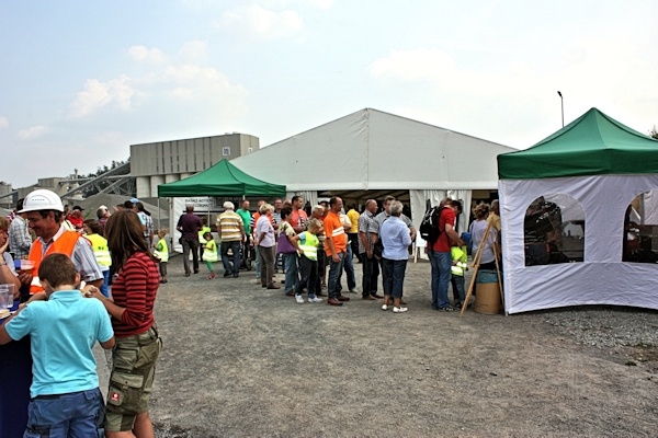 Parthensteins Bürgermeister Jürgen Kretschel und Rolf Langhof, Vorstand des Heimatvereins sowie Ortschronist von Großsteinberg, gehörten zu den Teilnehmern, ebenso der Großsteinberger Bauingenieur Eberhard Fischer. Offizieller Anlass: Eröffnung der neuen Aufbereitungsanlage und der Bahnverladung. Stefan Rüppel als Vertreter der Firmenleitung übernahm die Begrüßung der geladenen Gäste, gab einen Überblick über den geleisteten und nun zum Abschluss gebrachten Umbau des Werkes, der ja eigentlich ein Neuaufbau ist und er stellte die Gastredner vor, die gekommen waren, ein Grußwort zu sprechen. So war auch Europaabgeordneter Hermann Winkler (CDU) gekommen, der natürlich in seiner Rede einen Bogen schlug von den Unternehmen und Unternehmern bis hin zum Projekt Europäische Union. Jürgen Kretschel brachte die Anwesenden in seiner direkten und humorvollen Art mehrfach zum Schmunzeln. Eine Besichtigung des Bruches, von den Fachleuten als Tagebau bezeichnet, stand weiterhin auf dem Programm und danach als Abschluss eine Präsentation der historischen Entwicklung des Werkes und der eingesetzten Technik. Am folgenden Sonnabend standen die Türen offen für alle interessierten Gäste aus Großsteinberg, Parthenstein und der weiteren Umgebung. Doch wie feiert man einen solchen Anlass in einem Werk, wo alles aus Stein, Splitt und Staub besteht? Hartmut Hempel, Betriebsleiter des Großsteinberger Werkes und seine Mitarbeiterinnen und Mitarbeiter haben es jedenfalls verstanden, ihren Betrieb auf Hochglanz zu polieren. Für den Shuttle-Bus, der die Gäste in den Tagebau direkt vor Ort und wieder zurück brachte, gab es eine extra angelegte Fahrstraße. Die gut ausgeschilderten und mit vielen Informationen versehenen Rundgänge waren mit ordentlich aufgestellten Bauzäunen abgesichert. Um Staub zu verhindern, drehte ein Sprühfahrzeug seine Runden und hielt die Wege feucht. Das tut es übrigens auch während der ganz normalen Produktionstage, um die Umwelt mit so wenig wie möglich Staub zu belasten.